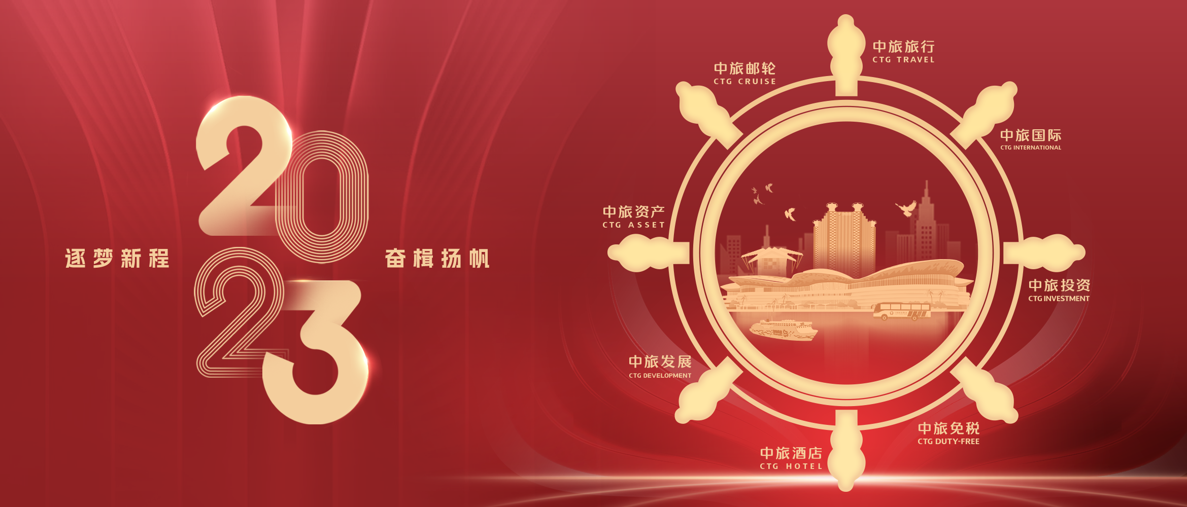 歲月如梭,華章日新。在這辭舊迎新的美好時刻,我們謹(jǐn)代表中國旅游集團(tuán)向長期以來關(guān)心和支持集團(tuán)事業(yè)發(fā)展的廣大消費者、客戶、合作伙伴以及社會各界朋友,向集團(tuán)全體干部員工、離退休老同事及員工家屬致以誠摯的謝意和新年的祝福!