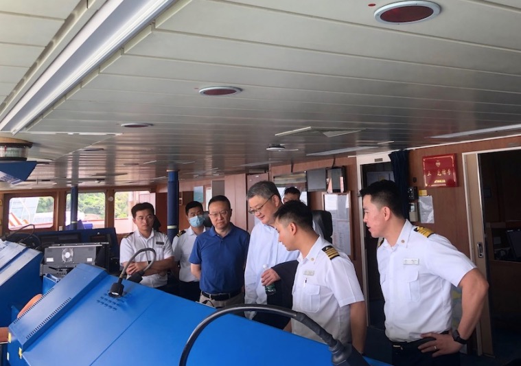 王總參觀了“鼓浪嶼”號公共區(qū)域,實地探訪了駕駛室、集控室、垃圾處理區(qū)域等船員工作生活區(qū)域,與一線船員深入了解船舶設施、設備的各項運營及維護情況。