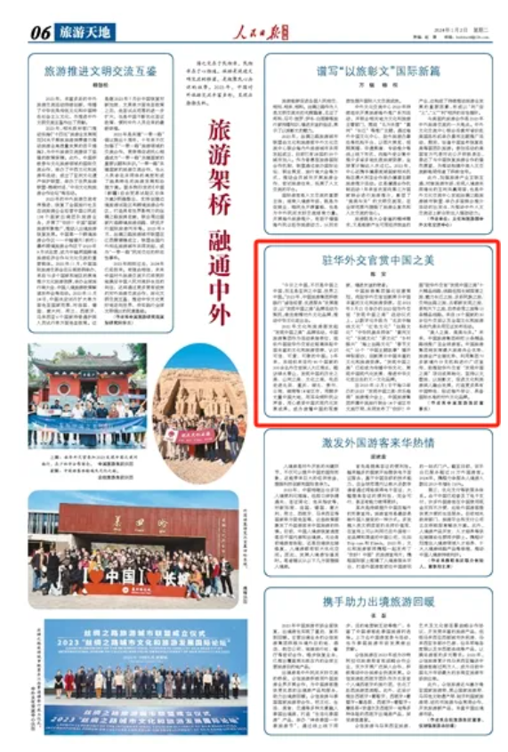 國之交在于民相親,民相親在于心相通。旅游是促進(jìn)文明交流的橋梁,是凝聚民心共識的紐帶。2023年,中國對外旅游交流豐富多彩,呈現(xiàn)出勃勃生機。2024年開年,人民日報海外版發(fā)表中國旅游集團(tuán)陳寅董事長署名文章,題為《駐華外交官賞中國之美》,介紹中國旅游集團(tuán)以“發(fā)現(xiàn)中國之美”品牌活動為契機,推動中華文化走出去。文章內(nèi)容如下: