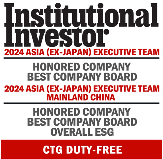 近日,國際權(quán)威金融雜志《Institutional Investor》公布了備受矚目的“2024年度亞洲最佳管理團(tuán)隊(duì)”評選結(jié)果。經(jīng)全球近6,000名基金經(jīng)理和分析師投票,中旅免稅榮登亞洲地區(qū)及中國大陸地區(qū)雙榜單,并在可選消費(fèi)品類別中榮膺多個(gè)重磅獎(jiǎng)項(xiàng):評選為“受尊崇企業(yè)”,榮獲“最佳董事會”(位列雙榜單第二名),“整體ESG表現(xiàn)”位列中國大陸地區(qū)榜單第三名。
