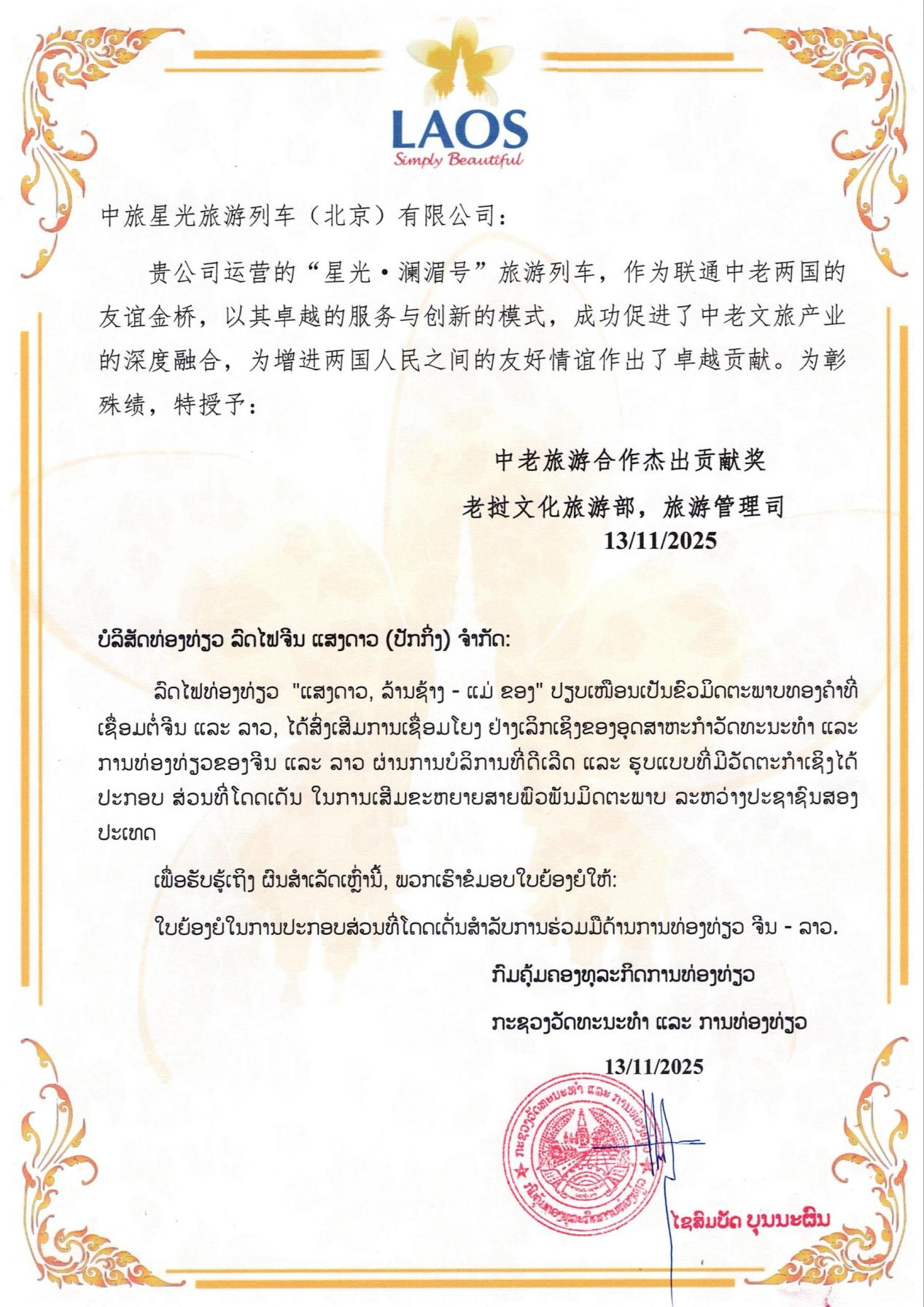 近日,“星光·瀾湄號(hào)”旅游列車獲老撾文化旅游部“中老旅游合作杰出貢獻(xiàn)獎(jiǎng)”,以表彰其在推動(dòng)中老文旅融合、增進(jìn)兩國(guó)人民友誼方面所做出的卓越貢獻(xiàn)。