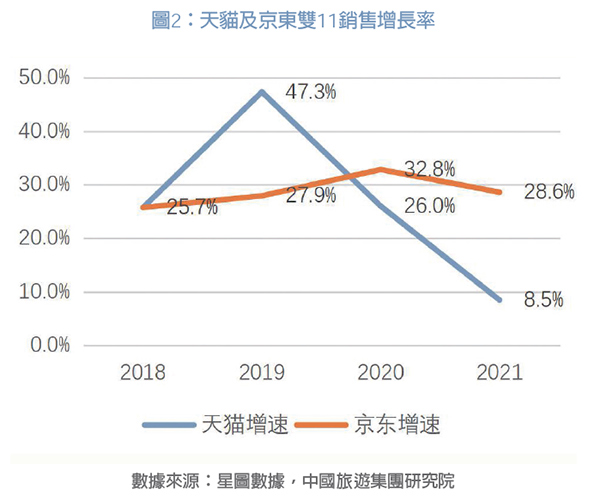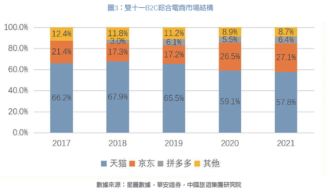 「雙11」成交額繼續(xù)上升,但整體增速放緩。2021年「雙11」全網(wǎng)成交9651億元,同比增長12.22%,相較2020年29%的增速出現(xiàn)下滑。天貓與京東仍然占據(jù)寡頭地位,占全網(wǎng)成交額的92.15%。整體來看,「雙11」在近期消費遇冷背景下表現(xiàn)平穩(wěn),天貓增長乏力不及預期,京東受益于商家二選一禁令增長亮眼。
