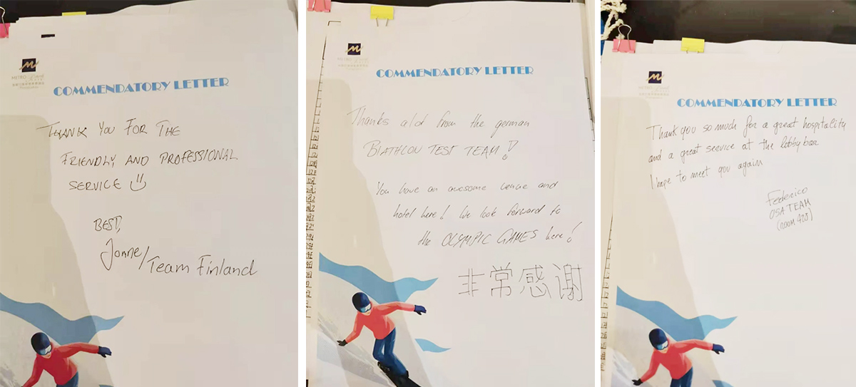 ——雪如意維景酒店接待來(lái)自9個(gè)國(guó)家的28位參加訓(xùn)練周的外籍媒體人。外方人員離店前,紛紛寫下了感言,表達(dá)了對(duì)酒店精心服務(wù)的感謝。