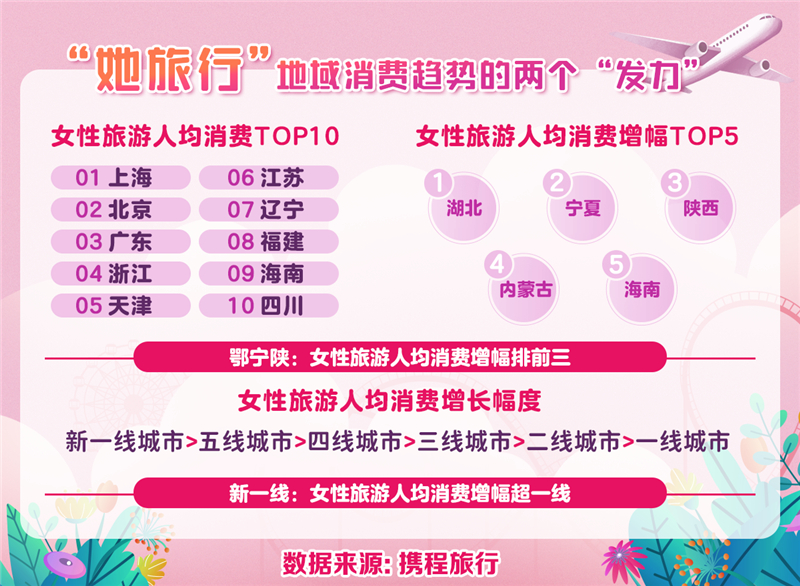 女性旅游人均消費增幅排序為:新一線城市、五線城市、四線城市、三線城市、二線城市、一線城市。