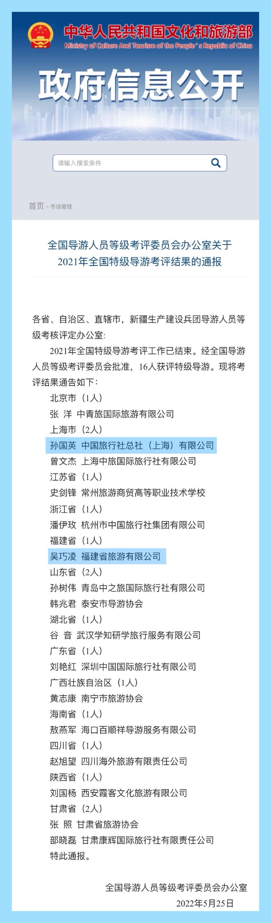 5月25日,文化和旅游部發(fā)布《全國導游人員等級考評委員會辦公室關于2021年全國特級導游考評結果的通報》。作為時隔24年后重啟的中國導游界至高榮譽,全國特級導游考評自去年10月啟動,歷經(jīng)七個月嚴格的初審和終審考核,最終確定集團旅行業(yè)務所屬福建省旅吳巧凌和中旅上海公司孫國英等在內的16名人員獲評此稱號。