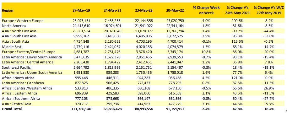 本周全球航空運力再次突破9000萬個座位數(shù),達(dá)到9120萬。比上周增加了2.4%,新增了210萬個座位,這也是疫情以來單周最高的運力值。這周運力增長明顯的地區(qū)包括歐洲,該地區(qū)增長占據(jù)整體增量的一半以上,體現(xiàn)該地區(qū)休閑游需求的復(fù)蘇,今年夏季需求將充分恢復(fù)。