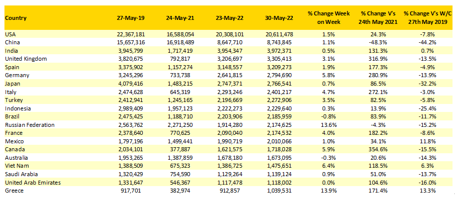 同比增長最快的是希臘,也正因此,希臘本周才得以躋身Top 20之列,將哥倫比亞擠出排行榜。本周希臘運力環(huán)比增長13.9%,比疫情之前的水平高出13.3%。這對于希臘及其烏佐酒生產(chǎn)商而言是好事,因為這意味著有更多的游客將到訪希臘,哪怕機場要排起長龍。