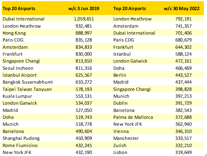 隨著西歐市場繼續(xù)強勢復(fù)蘇,國際機場的排行榜也變得頗具看點。目前全球Top 20的國際機場排行榜仍然由歐洲樞紐機場壟斷,西歐機場占據(jù)了16個席位。而值得關(guān)注的榜單缺席者包括有中國香港及臺北、韓國仁川、泰國曼谷、馬來西亞吉隆坡等機場,而新加坡機場已經(jīng)回歸Top 20之列,排在第11名,不過新加坡機場也只是恢復(fù)了2019年同期一半的運力。倫敦希思羅機場本周拔得頭籌,阿姆斯特丹緊隨其后。