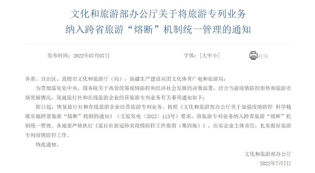 文化和旅游部辦公廳7月7日發(fā)布通知要求,即日起,恢復旅行社和在線旅游企業(yè)經(jīng)營旅游專列業(yè)務;按照相關規(guī)定,將旅游專列業(yè)務納入跨省旅游“熔斷”機制統(tǒng)一管理。